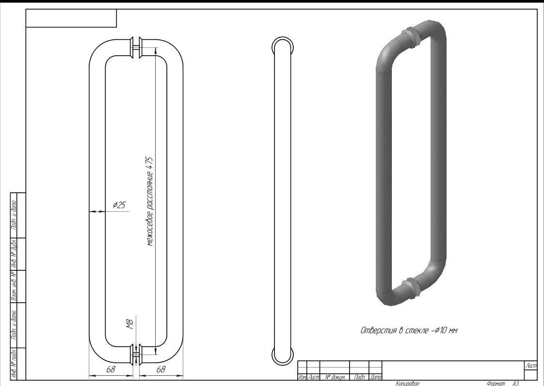 Ручка-скоба двухсторонняя для стеклянных дверей душевых кабин, офисных дверей. Отверстия в стекле Ø10-12 мм, межосевое расстояние 475 мм.